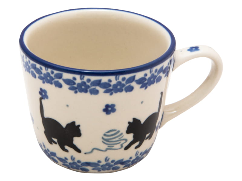 Design with cats in shades of blue and black. Cats playing with a ball of wool surrounded by floral patterns. The edge is finished in navy blue. Boleslawiec pottery - handpainted.
