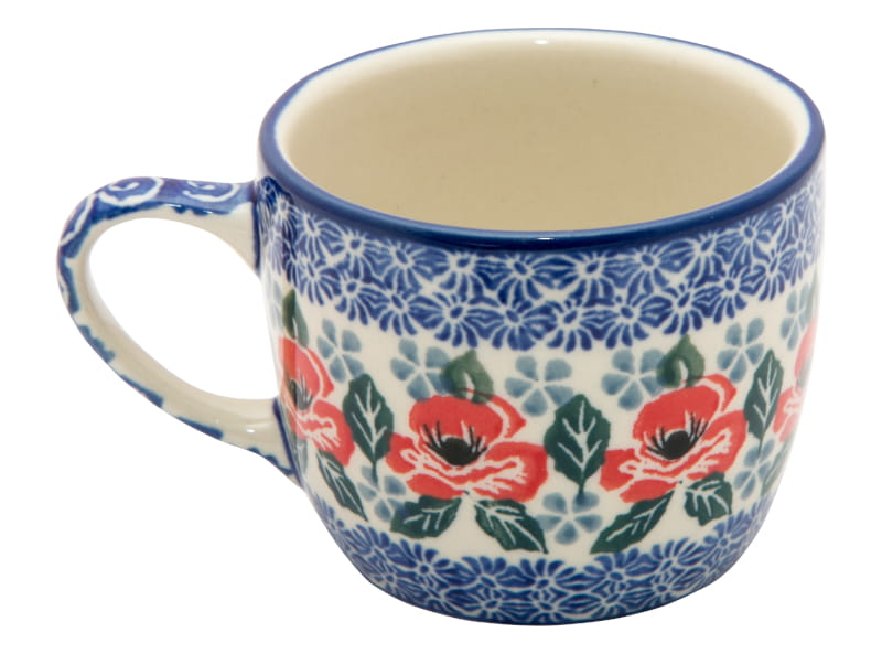 Ceramika Bolesławiec - Handmade. Wzór KWIATOWY w kolorze czerwonym. Wykończenie obrzeża w kolorze granatowym.
