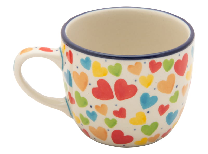 UNIQUE pattern - heart pattern. Different colored hearts in the colors of happiness. Border in navy blue. Boleslawiec pottery - handpainted.