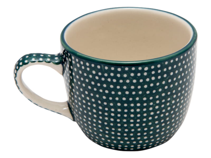 Unique pattern in a classic style, fine dots on a bottle green background. Border in bottle green. Boleslawiec pottery - handpainted.