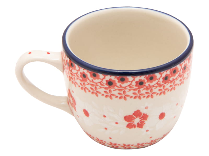 Boleslawiec pottery - HANDMADE. Pattern with flowers in delicate colors - red and white. The edge is finished in navy blue.