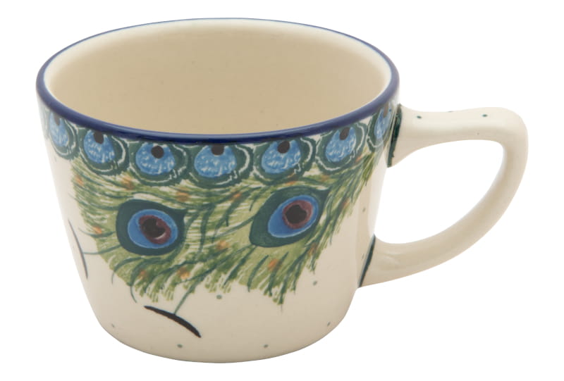 Boleslawiec pottery - handpainted. Pattern in green and cobalt blue. Unique peacock feathers motif. Border in navy blue.