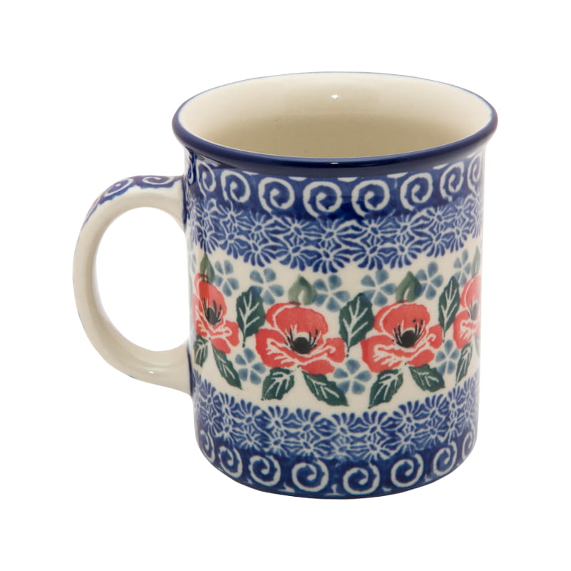 Ceramika Bolesławiec - Handmade. Wzór KWIATOWY w kolorze czerwonym. Wykończenie obrzeża w kolorze granatowym.
