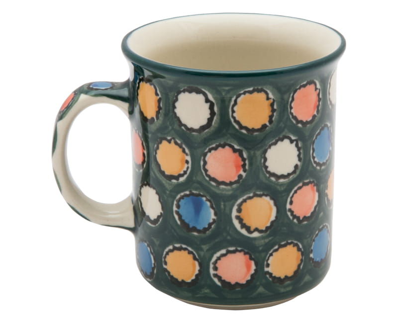 Boleslawiec pottery - handpainted. Unique pattern. Colorful, irregular dots on a green background. Border in green.