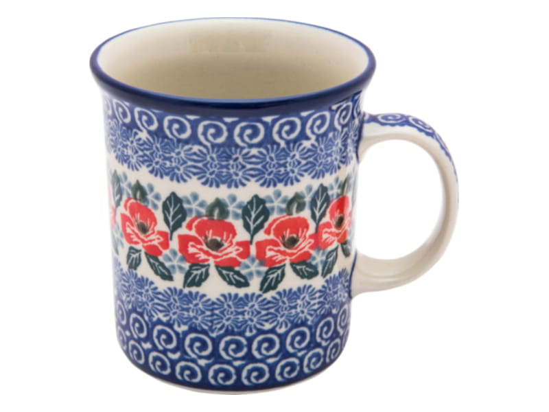 Boleslawiec pottery - handpainted. Floral patttern in red. Border in navy blue.