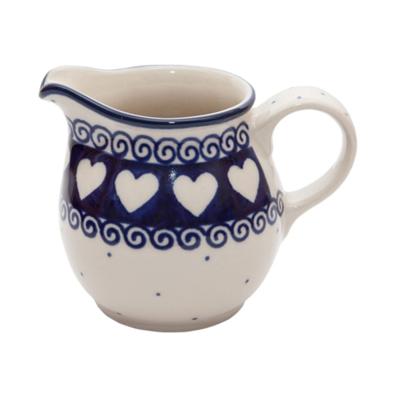 Boleslawiec pottery - handpainted. Classic pattern - a strip of white hearts on a navy blue background, fine dots and spirals in navy blue. Border in navy blue.
