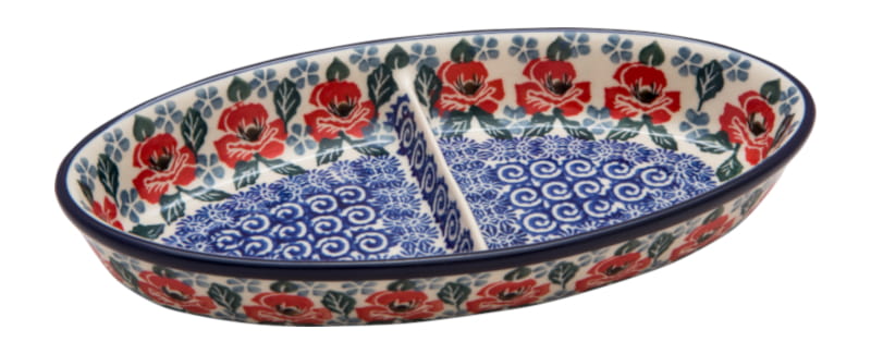 Boleslawiec pottery - handpainted. Floral patttern in red. Border in navy blue.