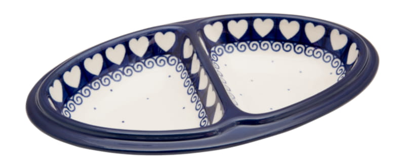 Classic pattern - a strip of white hearts on a navy blue background, fine dots and spirals in navy blue. Border in navy blue. Boleslawiec pottery - handpainted.