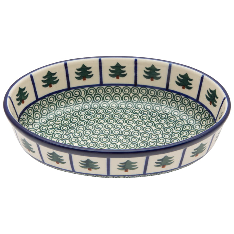 Boleslawiec pottery - handpainted. Classic pattern in a vintage style - green spirals with navy blue motifs and green Christmas trees. Border in navy blue.