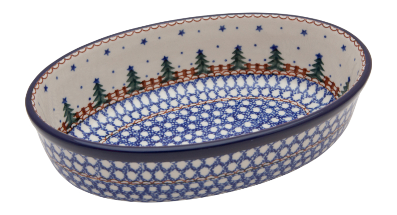 Christmas pattern in vintage style in blue and brown colors with a Christmas tree, stars and snow. Geometric circle pattern and brown fence. The edge in navy blue. Boleslawiec pottery - handpainted.
