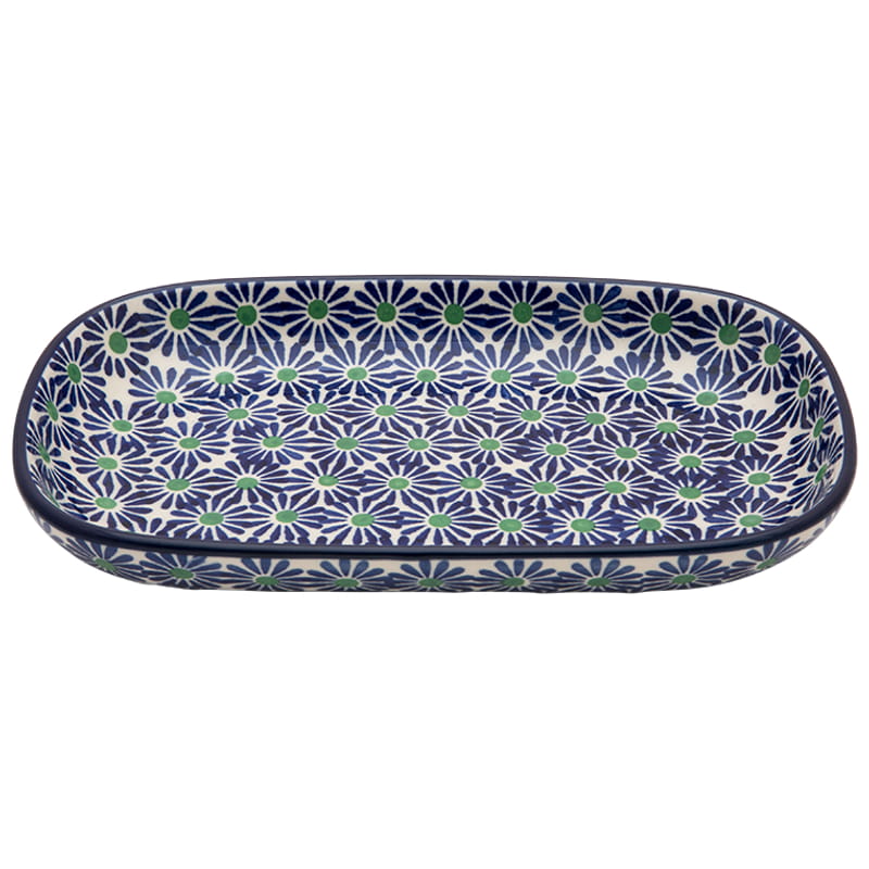 Boleslawiec pottery - handpainted. Floral pattern in navy blue and green. Border navy blue.