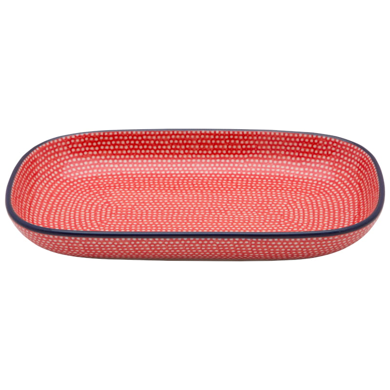 Boleslawiec pottery - handpainted. Unique pattern in a classic style - fine dots on a red background. Border in navy blue.