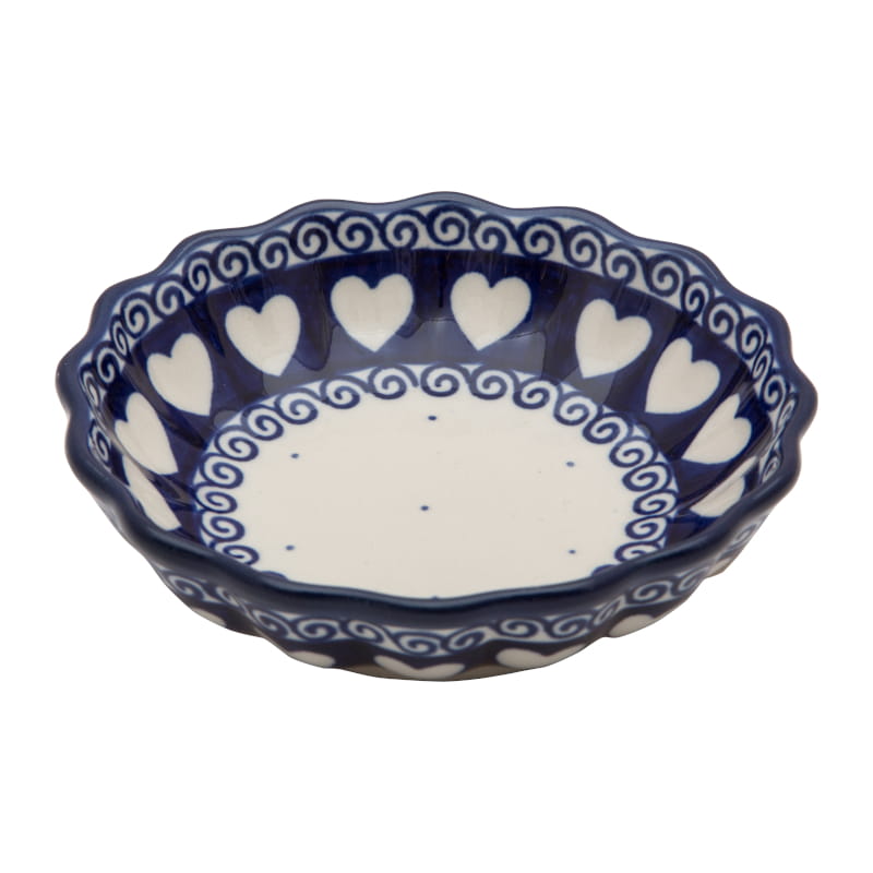 Boleslawiec pottery - handpainted. Classic pattern - a strip of white hearts on a navy blue background, fine dots and spirals in navy blue. Border in navy blue.
