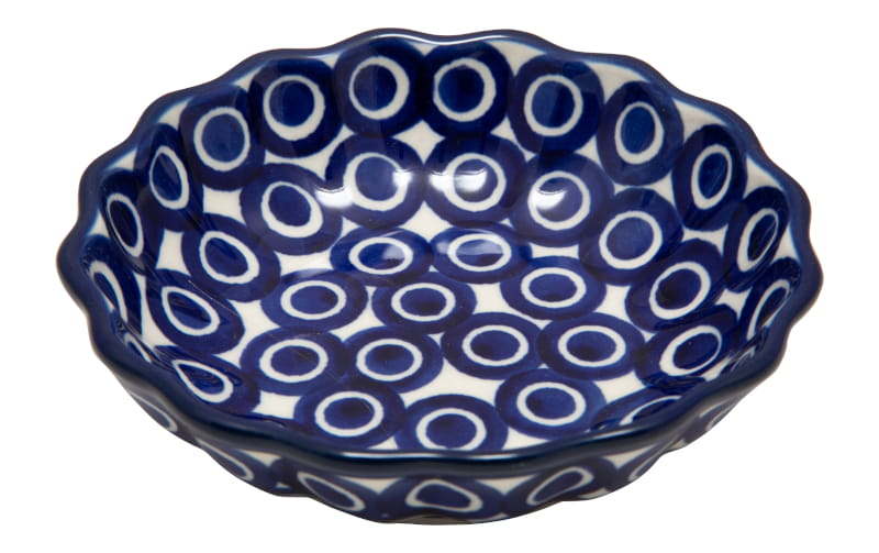 Boleslawiec pottery - handpainted. Classic pattern in a vintage style - large eye-like circles on a white background. Border in navy blue.