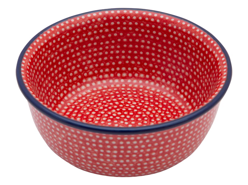 Boleslawiec pottery - handpainted. Unique pattern in a classic style - fine dots on a red background. Border in navy blue.