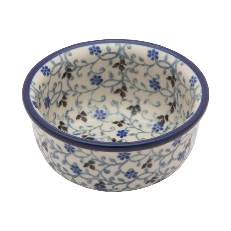 Wzór z motywem roślinnym i kwiatowym z dominującym kolorem granatowym. Wykończenie obrzeża w kolorze granatowym. Ceramika Bolesławiec - Handmade.
