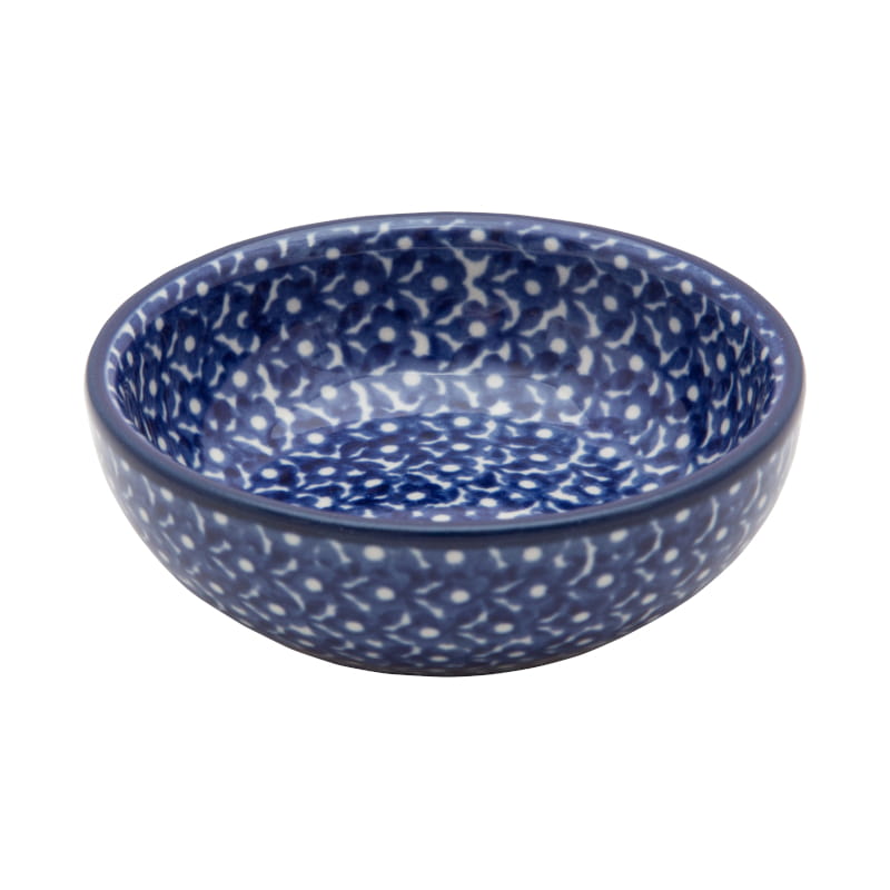 Boleslawiec pottery - handpainted. Ornamental pattern in navy blue. Border in navy blue.