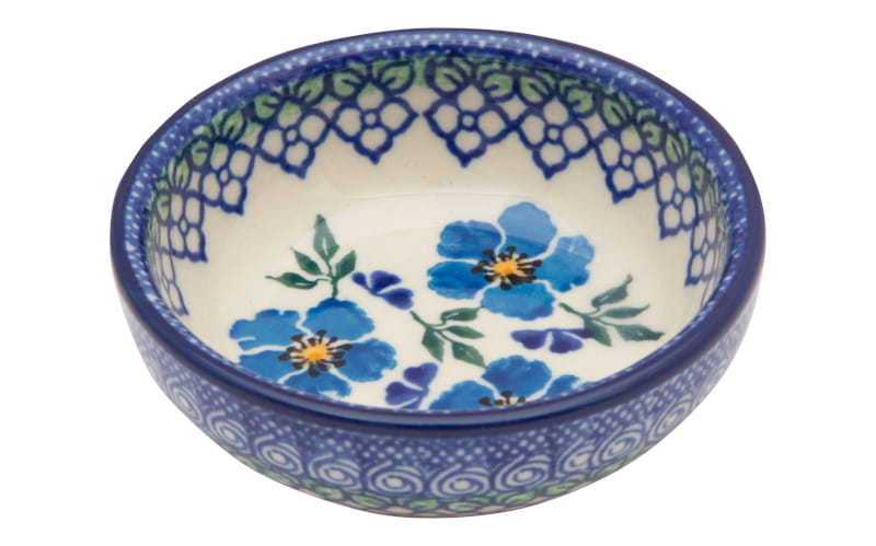 Boleslawiec pottery - handpainted. Floral pattern in sky blue. The edge in navy blue.