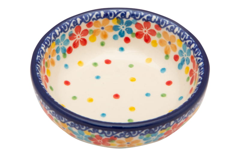 Floral pattern in yellow, blue and red. The edge in navy blue. Boleslawiec pottery - handpainted.