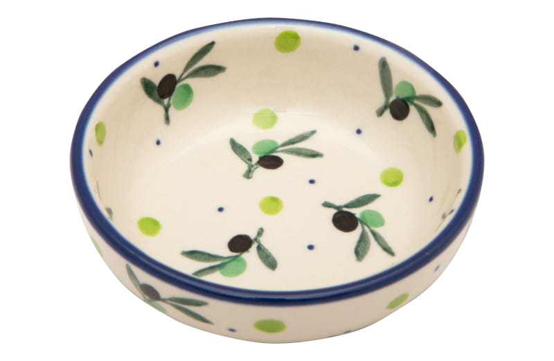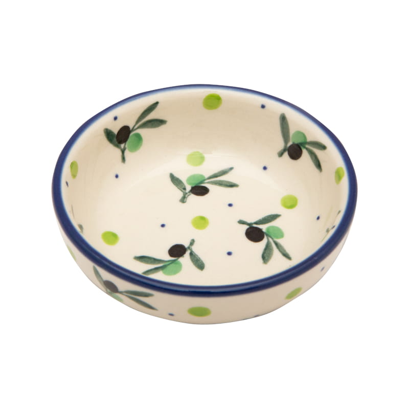 Pattern with olives in light shades of green color and black. A delicate theme reminiscent of holiday travels. The edge is finished in navy blue. Boleslawiec pottery - handpainted.