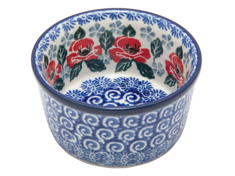 Ceramika Bolesławiec - Handmade. Wzór KWIATOWY w kolorze czerwonym. Wykończenie obrzeża w kolorze granatowym.