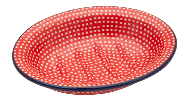 Boleslawiec pottery - handpainted. Unique pattern in a classic style - fine dots on a red background. Border in navy blue.