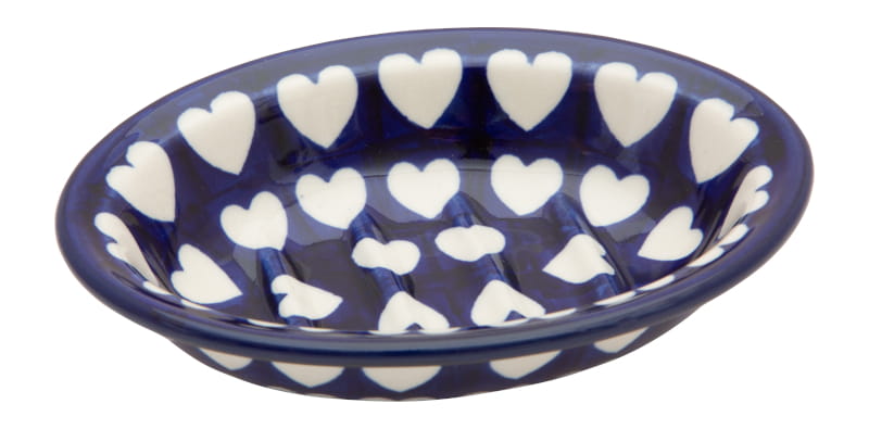 Boleslawiec pottery - handpainted. Classic pattern in a vintage style. White hearts on a navy blue background. Border in navy blue.