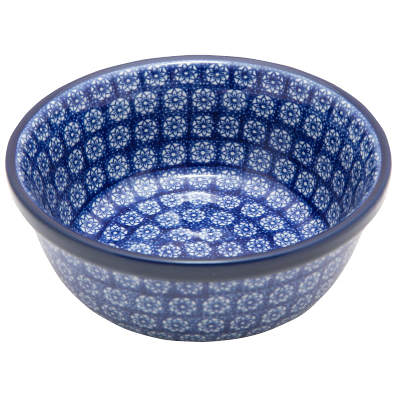 Boleslawiec pottery - handpainted. Ornamental pattern in navy blue. Border in navy blue.