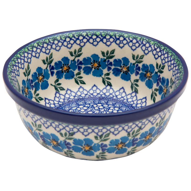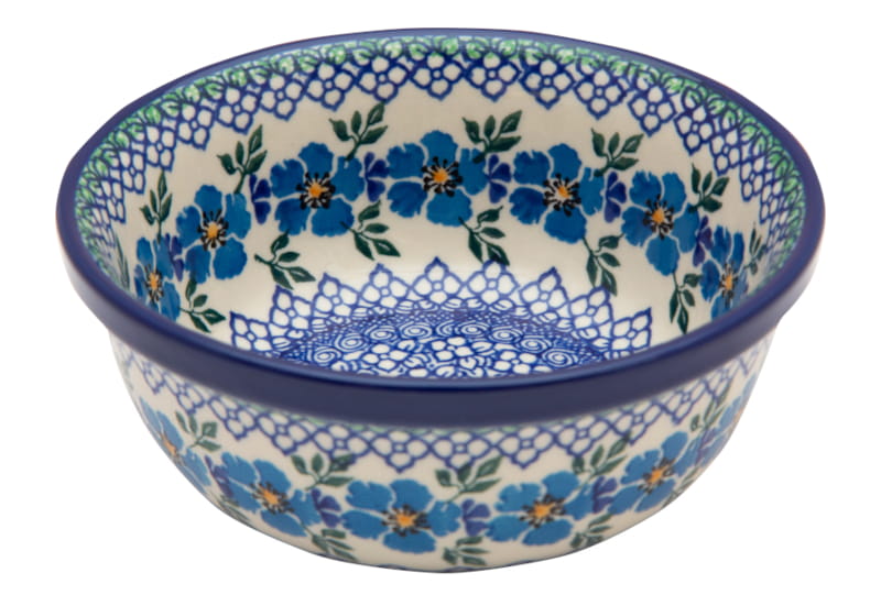 Boleslawiec pottery - handpainted. Floral pattern in sky blue. Border in navy blue.