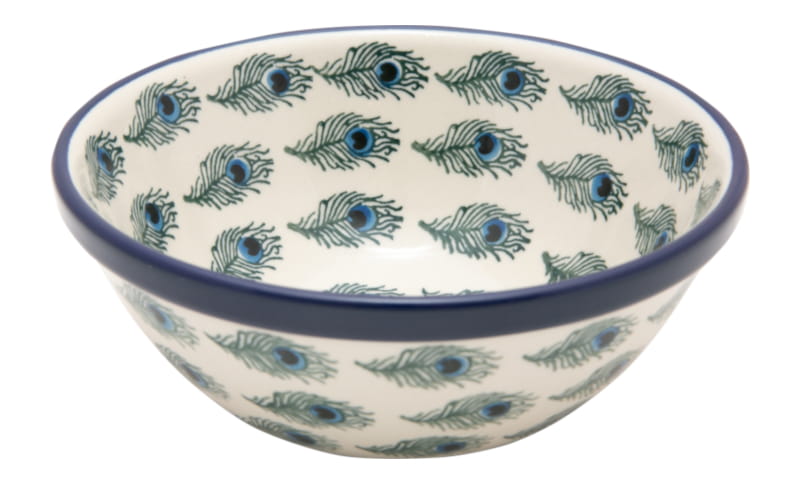Boleslawiec pottery - handpainted. Pattern in green and cobalt blue. Unique peacock feathers motif. Border in navy blue.