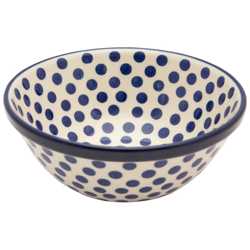 Boleslawiec pottery - handpainted. Classic pattern in a vintage style - navy blue dots on a white background. Border in navy blue.