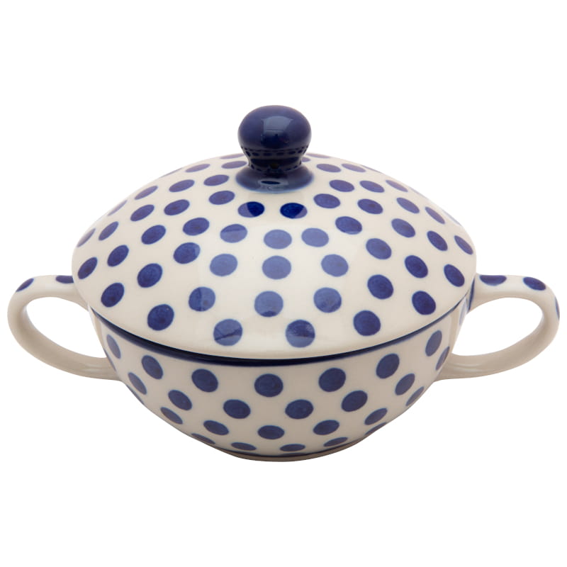 Boleslawiec pottery - handpainted. Classic pattern in a vintage style - navy blue dots on a white background. Border in navy blue.