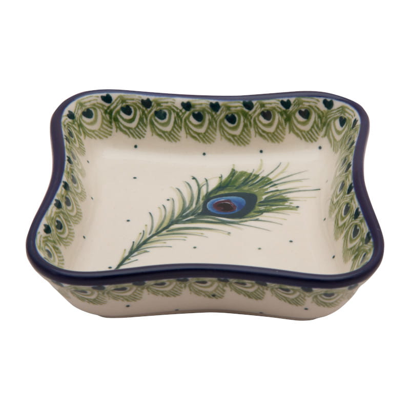 Boleslawiec pottery - handpainted. Pattern in green and cobalt blue. Unique peacock feathers motif. Border in navy blue.