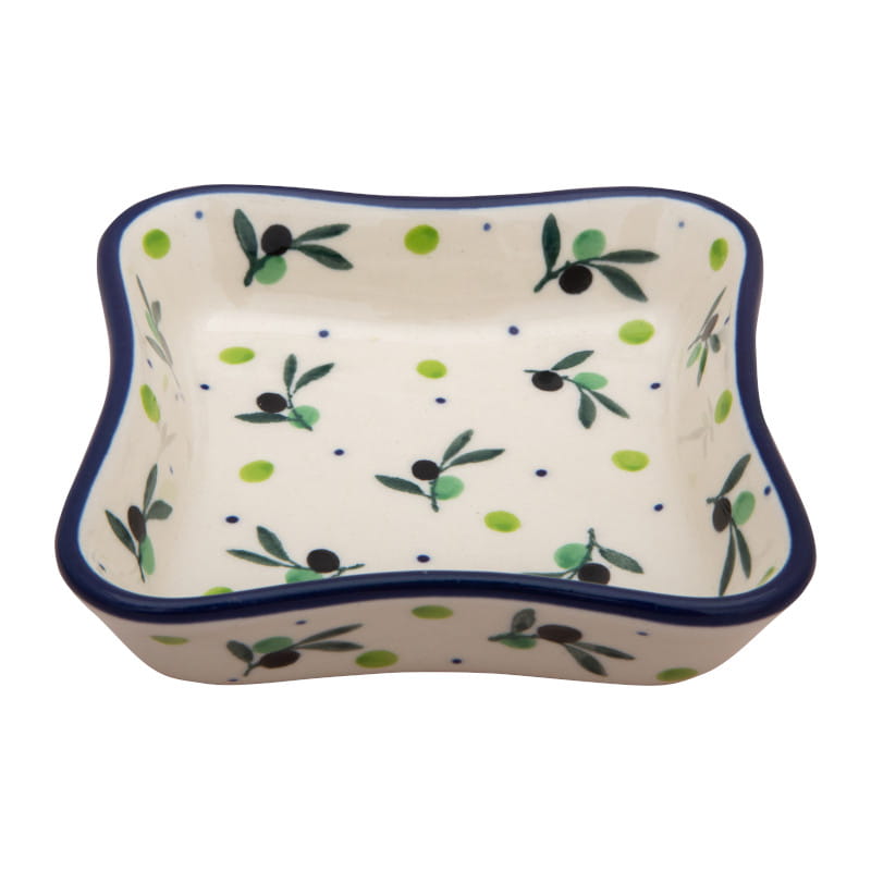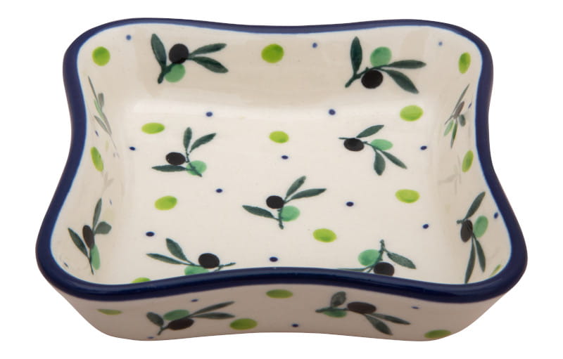 Pattern with olives in light shades of green color and black. A delicate theme reminiscent of holiday travels. The edge is finished in navy blue. Boleslawiec pottery - handpainted.