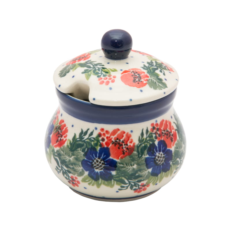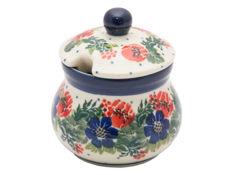 Floral pattern in red and navy blue. Boleslawiec pottery - handpainted.
