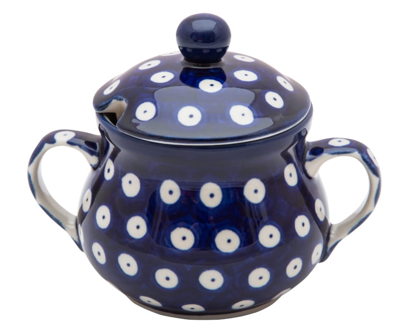 Classic pattern with navy blue background. White circles on navy blue background. The edge in navy blue. Boleslawiec pottery - handpainted.