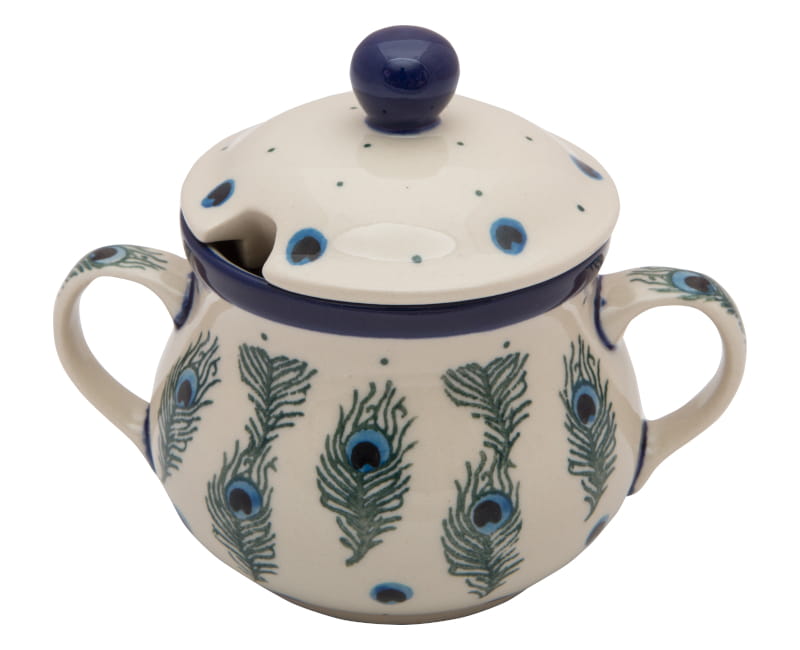 Boleslawiec pottery - handpainted. Pattern in green and cobalt blue. Unique peacock feathers motif. Border in navy blue.