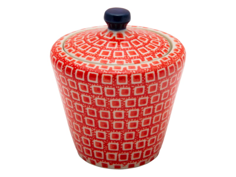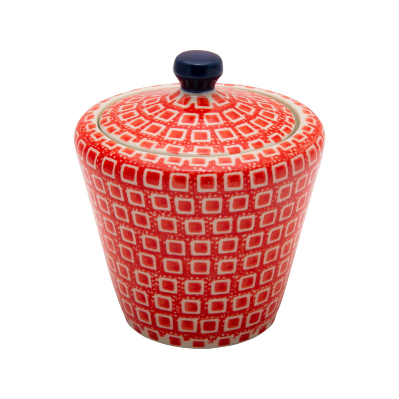 Boleslawiec pottery - handpainted. Vintage style pattern. Fine white squares and dots on a red backgrounds. Border in navy blue.