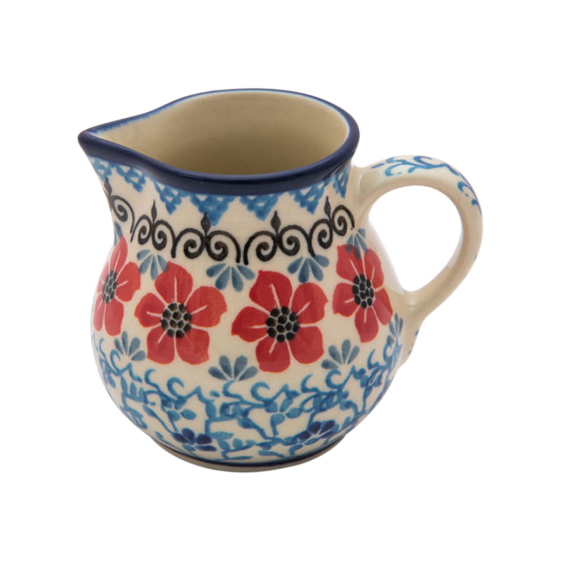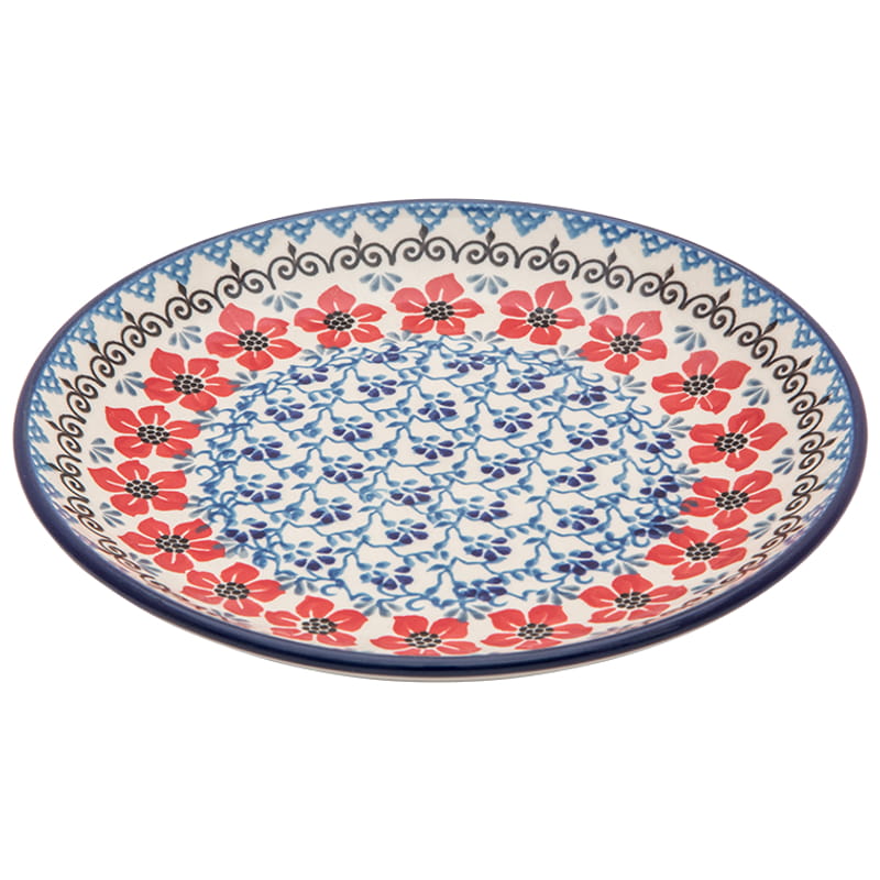 Boleslawiec pottery - handpainted. Floral pattern in red and blue. Border in navy blue.