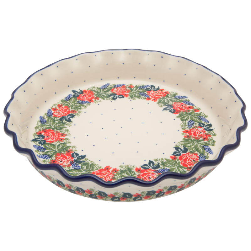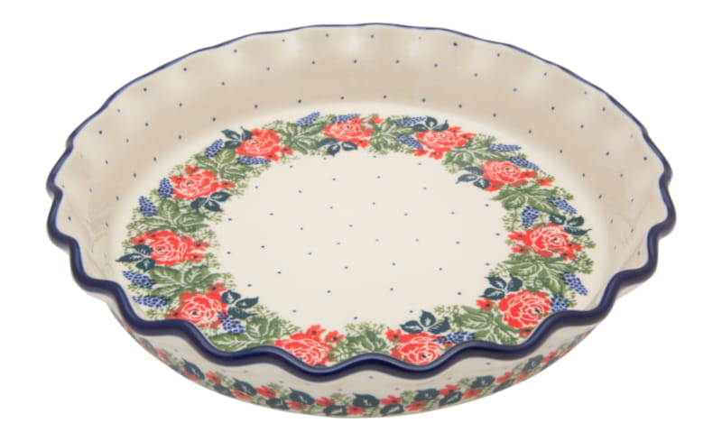 Boleslawiec pottery - handpainted. Floral pattern in red, blue and green. Border in navy blue.