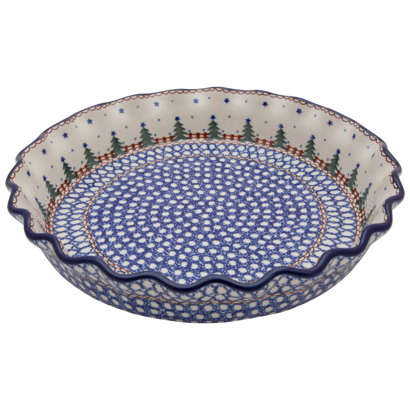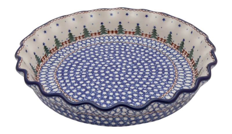 Christmas pattern in vintage style in blue and brown colors with a Christmas tree, stars and snow. The edge in navy blue. Boleslawiec pottery - handpainted.