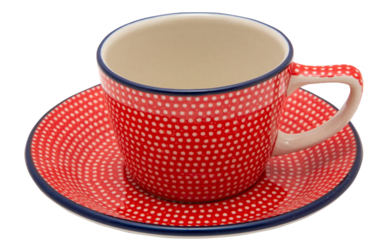 Boleslawiec pottery - handpainted. Unique pattern in a classic style - fine dots on a red background. Border in navy blue.
