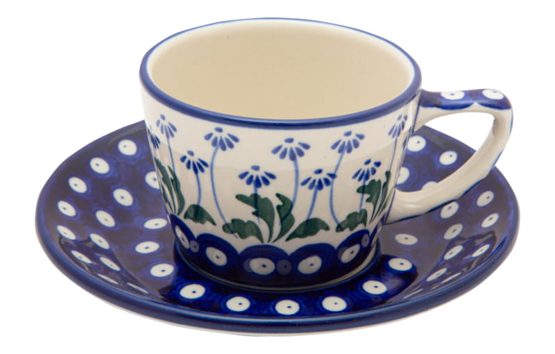 Boleslawiec pottery - handpainted. Classic pattern with plant motifs. Border in navy blue.