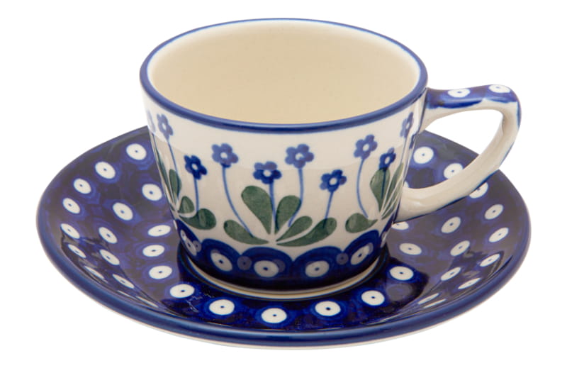 Boleslawiec pottery - handpainted. Classic pattern with plant motifs. Border in navy blue.