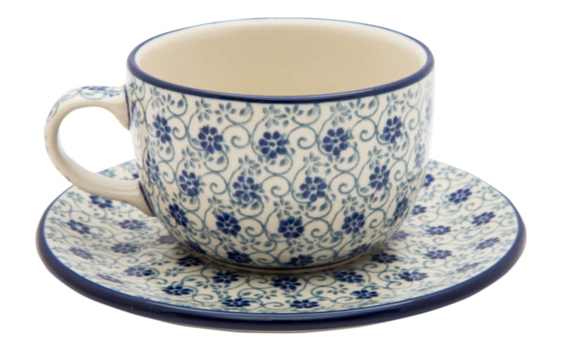 Boleslawiec pottery - handpainted. Floral pattern in navy blue and light gray. Border in navy blue.