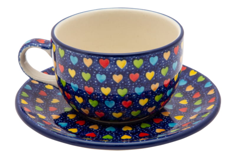 UNIQUE pattern - Heart pattern. Multicolored hearts on a navy blue background. Border in navy blue. Boleslawiec pottery - handpainted.