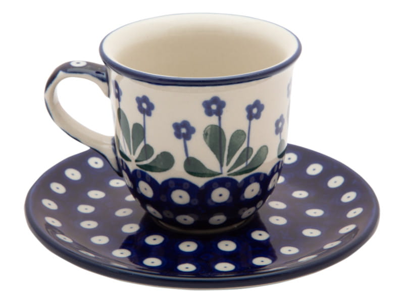 Boleslawiec pottery - handpainted. Classic pattern with plant motifs. Border in navy blue.