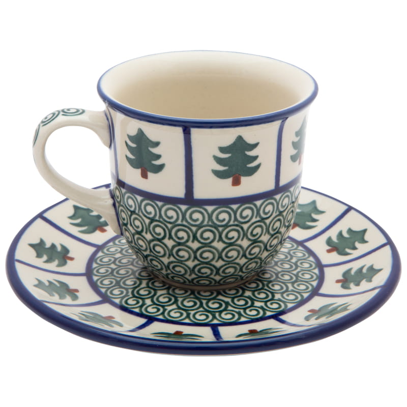 Boleslawiec pottery - handpainted. Classic pattern in a vintage style - green spirals with navy blue motifs and green Christmas trees. Border in navy blue.