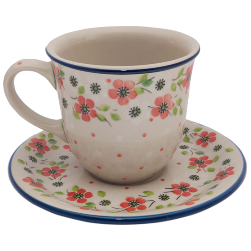 Boleslawiec pottery - handpainted. Floral pattern with dominant white and red. Border in navy blue.