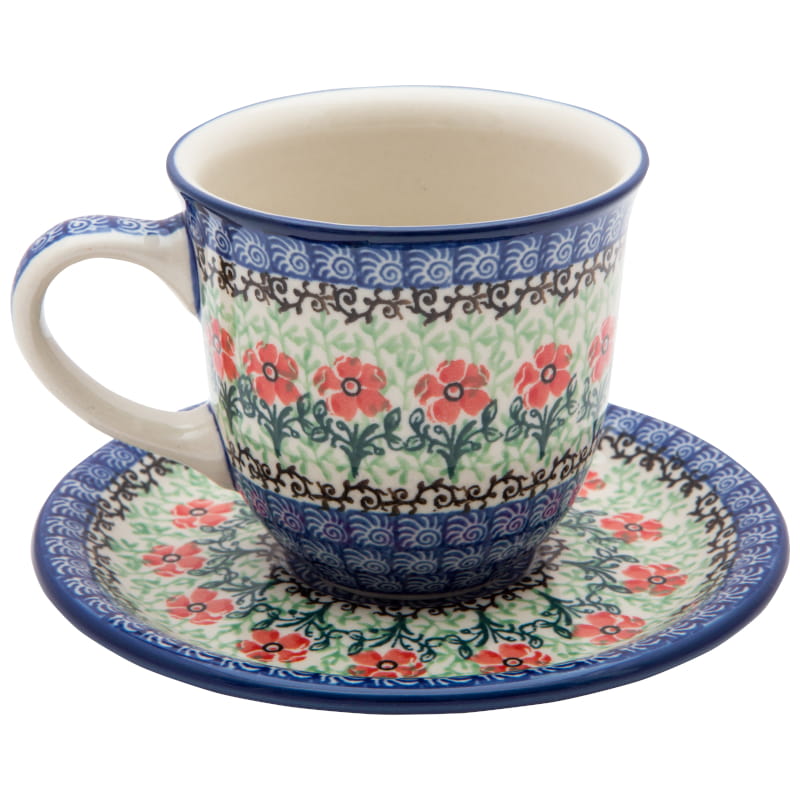 Ceramika Bolesławiec - HANDMADE. Wzór kwiatowy w kolorze czerwonym i motywami roślinnymi - OGRÓD NA TALERZU. Wykończenie obrzeża w kolorze granatowym.